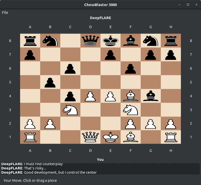 Our opponent DeepFLARE is the black side and waits for our move. Let’s make a move. We move the knight from B1 to A3.