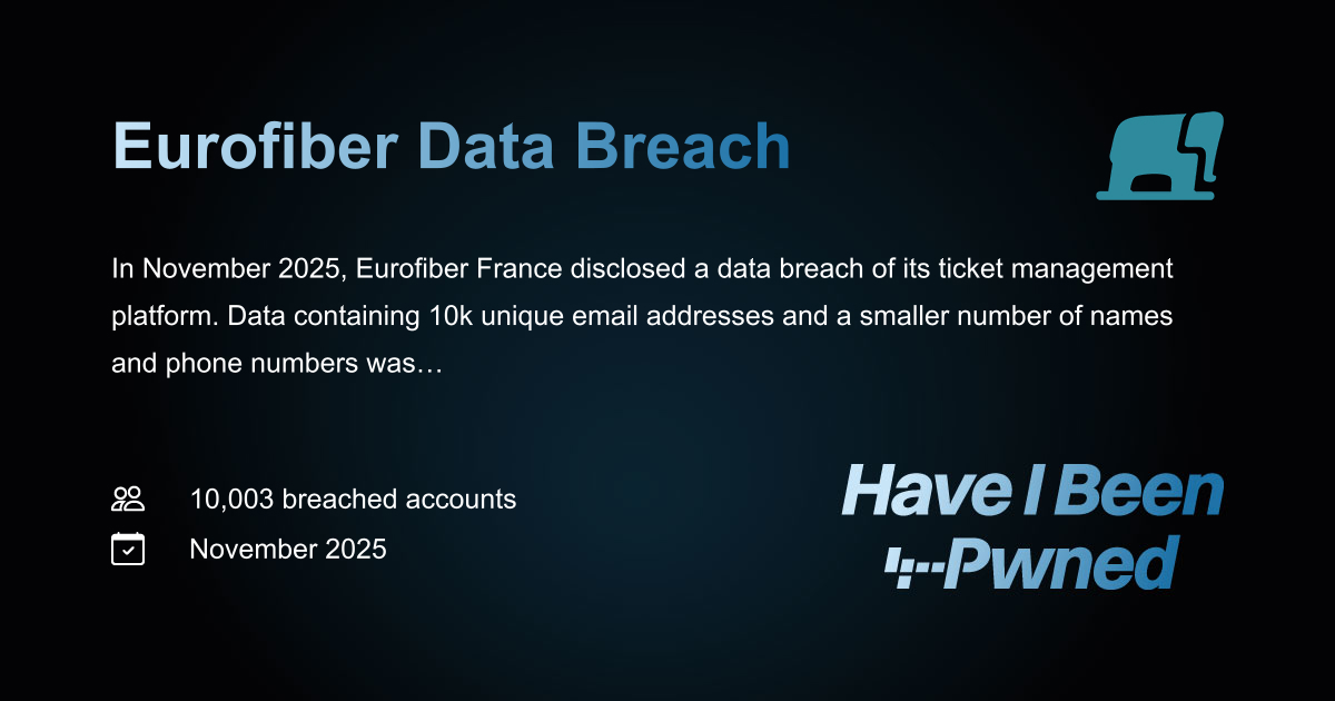 In November 2025, Eurofiber France disclosed a data breach of its ticket management platform. Data containing 10k unique email addresses and a smaller number of names and phone numbers was subsequently leaked. A threat actor claiming responsibility for the breach alleges to have additional, more sensitive data including screenshots, VPN configuration files, credentials, source code, certificates, archives, and SQL backup files.