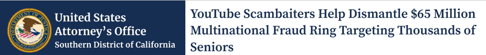 At the end of August 2025, The US Attorney’s office in San Diego announced four indictments against members of a Chinese organized crime ring that stole at least $65 million from thousands of older Americans. The case was notable because the US Attorney credited two YouTube channels with the leads that led to 25 arrests so far in California, New York, Texas, and Michigan.